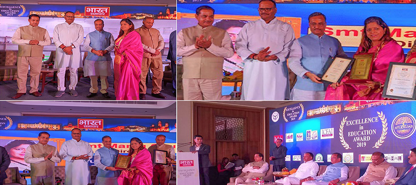Mrs Manju Gaur, Director Gaurs Group, receiving the Excellence in Education Award 2019 for Best Curriculum and Best Social Awareness for Gaurs International School. Award given by Shri Dinesh Sharmaji, Deputy Chief Minister UP Govt.