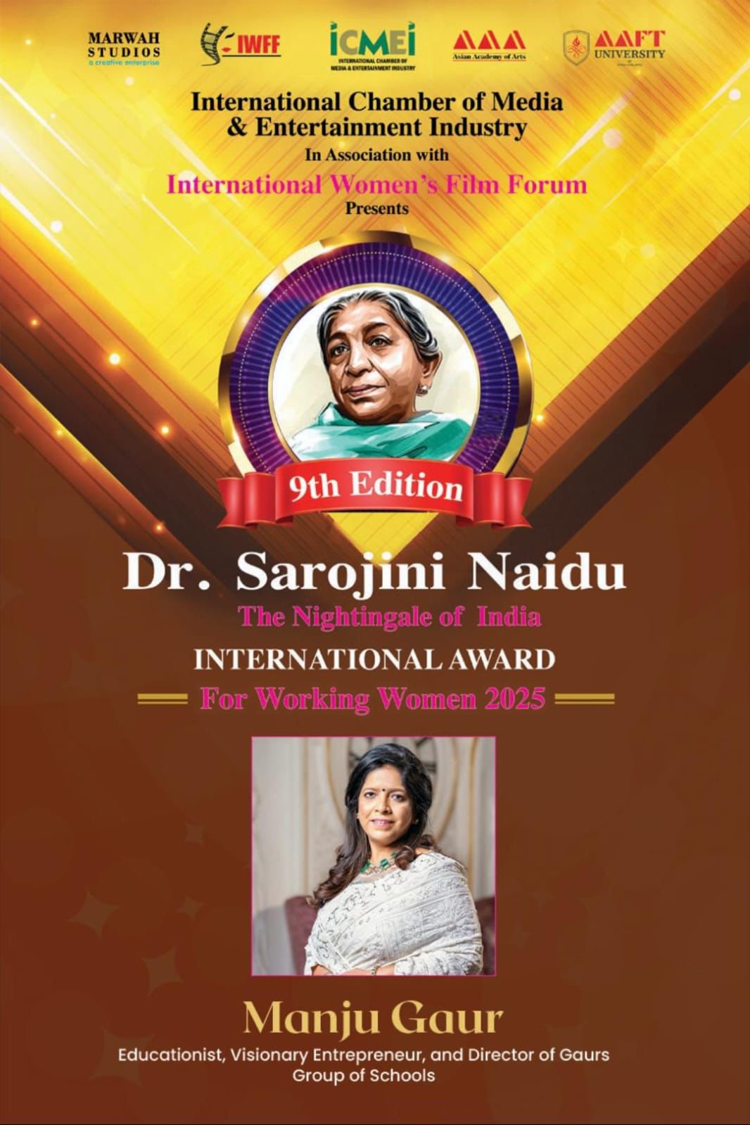 With immense pride and joy, we are delighted to share that our honourable Director, Ms. Manju Gaur, has been felicitated with the prestigious Dr. Sarojini Naidu International Award for Working Women by the International Women’s Film Forum.